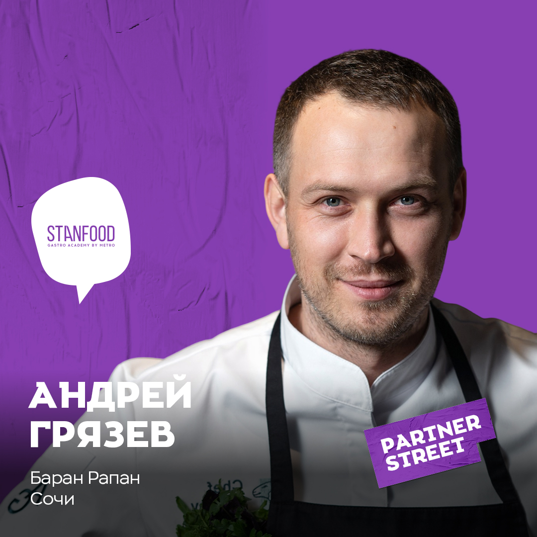 Андрей Грязев — шеф-повар ресторана «Баран-Рапан». Начал работу с повара горячего шефа, был су-шефом Андрея Колодяжного и Валерия Порядина в «Баран-Рапан», был шеф-поваром Viju Bar с 2018 года, после реконструкции возглавил кухню «Баран-Рапан» в 2020 году. Работает и регулярно обновляет (в зависимости от сезона) сразу с два меню ресторана «Баран-Рапан», каждое из которых отвечает своей концепции.